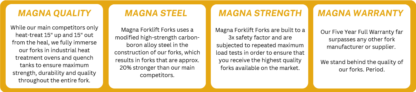 Our forklift forks are designed to meet or exceed OEM specifications for all major brands, including Toyota®, Hyster®, Yale®, CAT®, Nissan®, Mitsubishi®, Crown®, Clark®, Komatsu®, Doosan®, Unicarrier®, and Raymond®.
